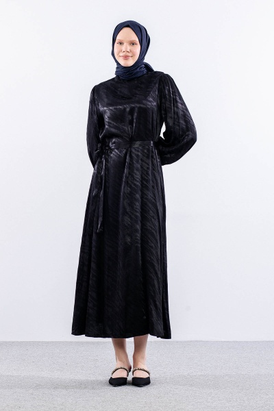 2573 Elbise 36-44 Balon Kol Saten Jakar Detay - Lacivert - 3